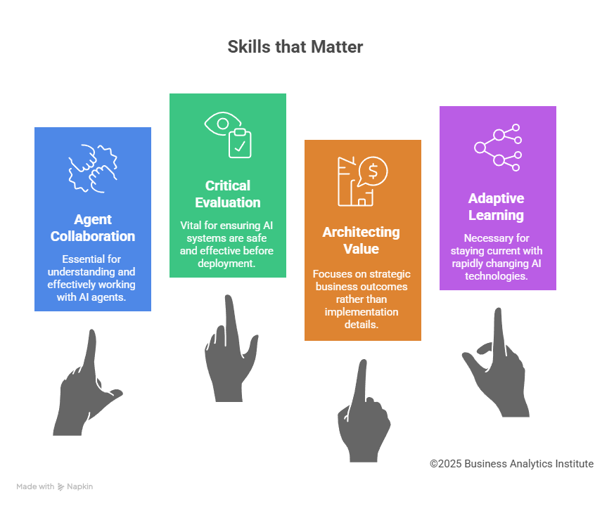 Identify which aspects of your role involve judgment, relationship building, and contextual decision-making versus routine execution. Double down on the former while learning to delegate the latter—but never delegate without guardrails. Build expertise in evaluating agent outputs against tangible business objectives.